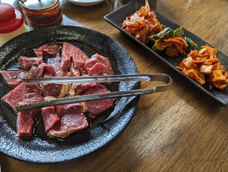 自家製キムチ三種盛り、ライス、鹿ももなどを注文しました。